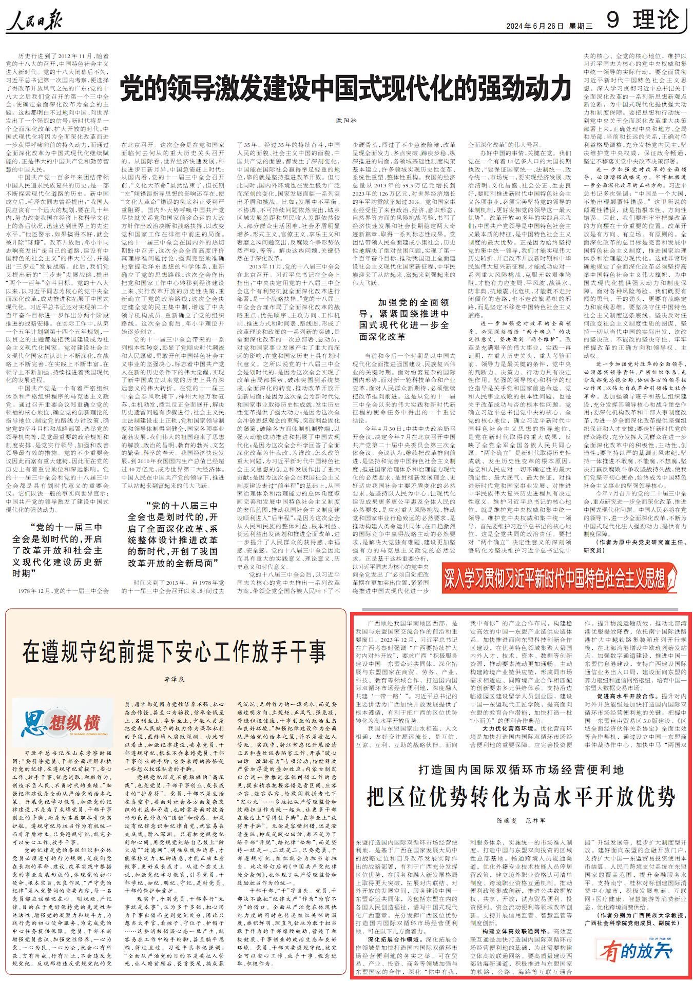 2024年6月26日,广西民族大学betway必威西汉姆联/中国-东盟区域国别研究院陈瑶雯教授团队在《人民日报》理论版发表了重要研究成果《打造国内国际双循环市场经营便利地 把区位优势转化为高水平开放优势》,广西民族大学为第一作者署名单位。
