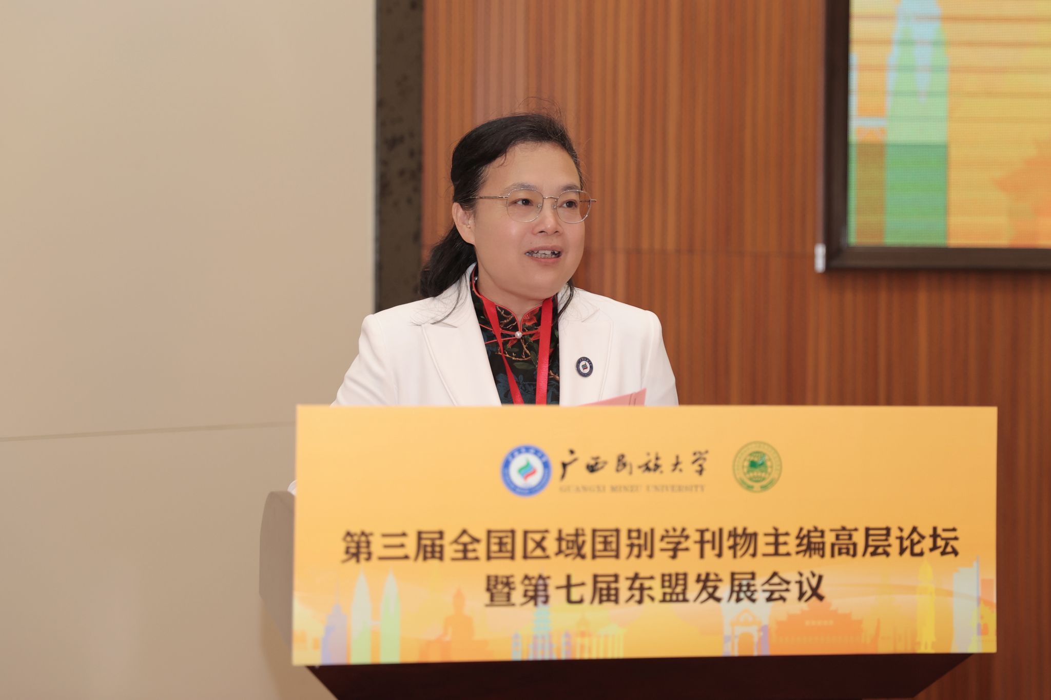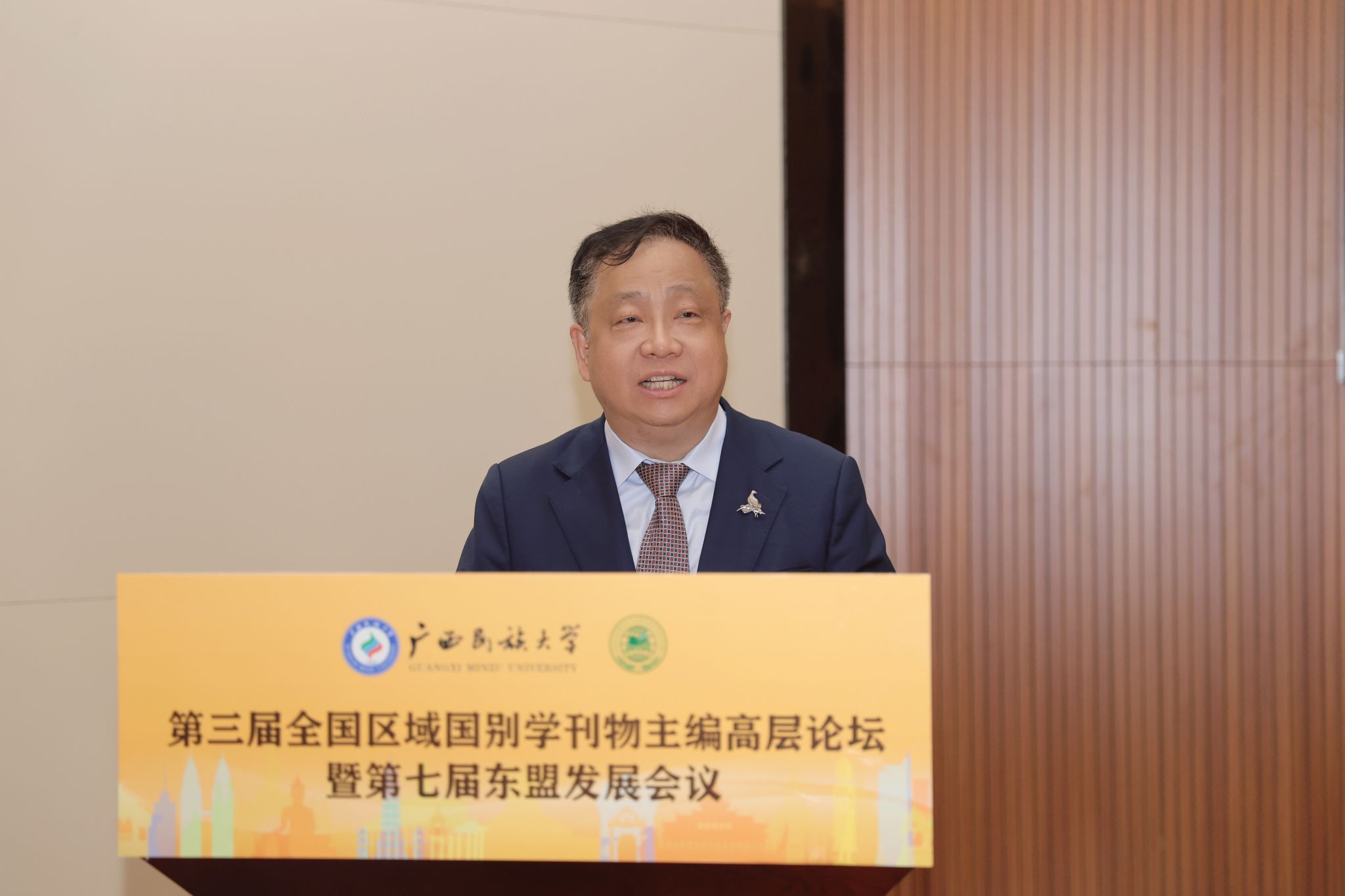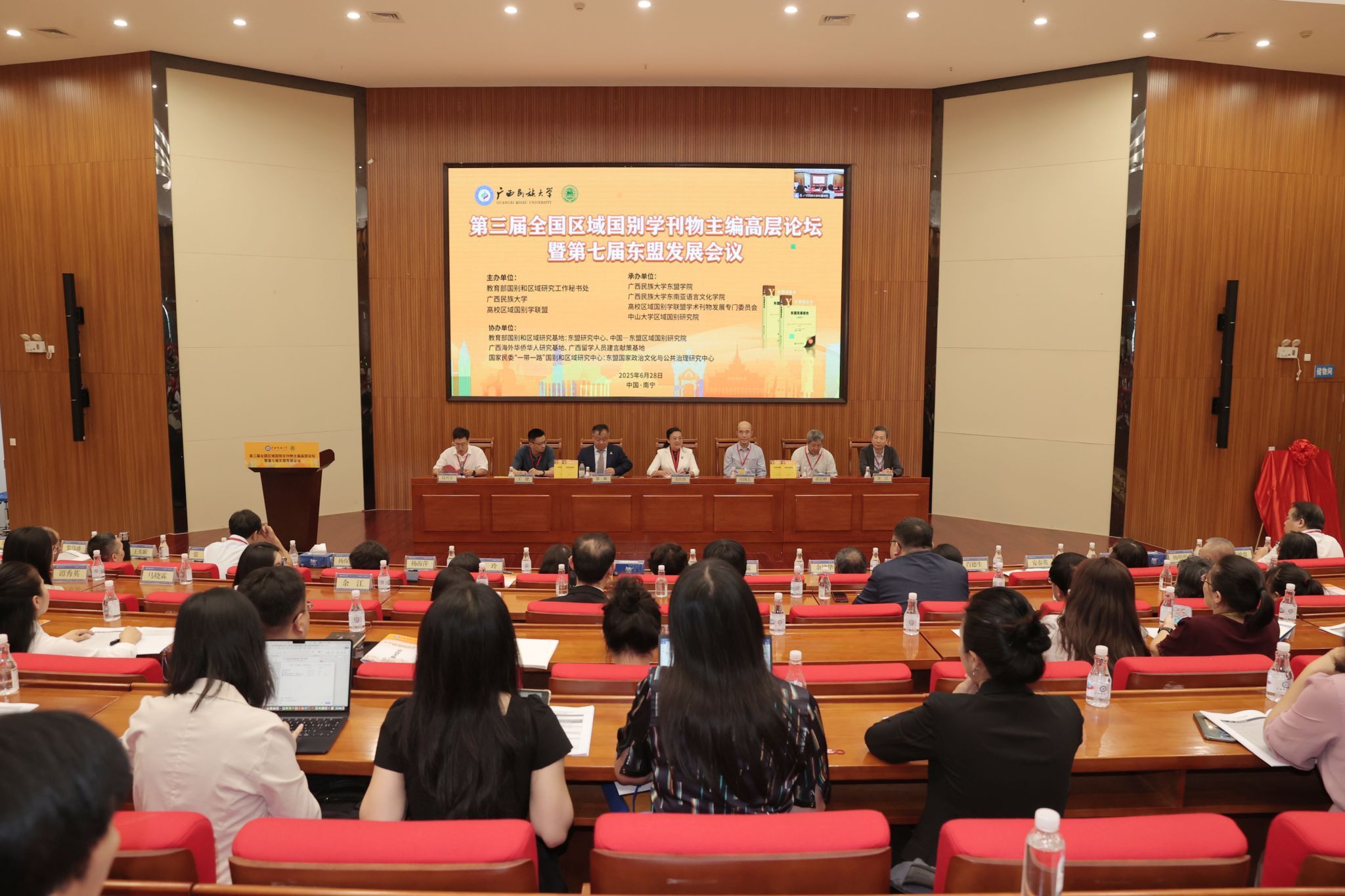 【大学生通讯社报道】6月28日,第三届全国区域国别学刊物主编高层论坛暨第七届东盟发展会议在广西民族大学思源湖校区图书馆报告厅举行。广西民族大学校长韦仕珍,教育部国别和区域研究工作秘书处主任、高校区域国别学联盟学术委员会主席罗林出席会议并致辞。高校区域国别学联盟秘书长、中山大学区域国别研究院院长陈杰,天津外国语大学《世界文化》主编、天津商业大学副校长余江,上海社会科学院《史林》主编、历史研究所所长郭长刚,上海社会科学院《国际关系研究》主编、国际问题研究所所长王健,《南洋问题研究》主编、厦门大学国际关系学院/南洋问题研究院教授、广西民族大学“八桂学者”庄国土以及国内高等院校和科研机构专家学者参加会议。广西民族大学副校长高兴宇主持开幕式。