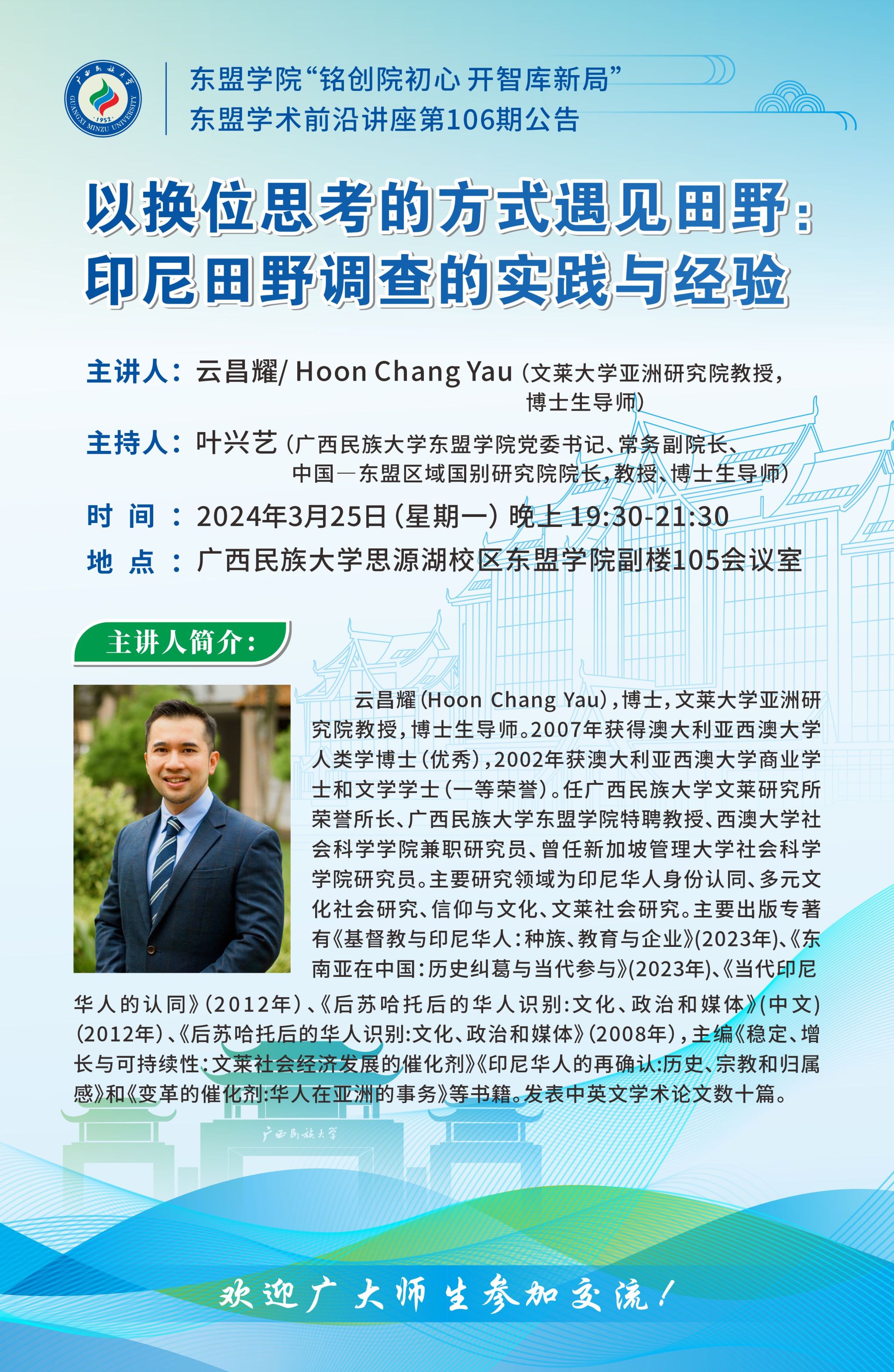 主 题:以换位思考的方式遇见田野:印尼田野调查的实践与经验 主讲人:云昌耀/ Hoon Chang Yau(文莱大学亚洲研究院教授,博士生导师) 主持人:叶兴艺 (广西民族大学betway必威西汉姆联党委书记、常务副院长、中国—东盟区域国别研究院院长,教授、博士生导师) 时 间:2024年3月25日(星期一) 晚上 19:30-21:30 地 点:广西民族大学思源湖校区betway必威西汉姆联副楼105会议室 欢迎广大师生参加、交流! 广西民族大学betway必威西汉姆联 中国—东盟区域国别研究院 2024年3月22日 主讲人简介: 云昌耀(Hoon Chang Yau),博士,文莱大学亚洲研究院教授,博士生导师。2007年获得澳大利亚西澳大学人类学博士(优秀),2002年获澳大利亚西澳大学商业学士和文学学士(一等荣誉)。任广西民族大学文莱研究所荣誉所长、广西民族大学betway必威西汉姆联特聘教授、西澳大学社会科学学院兼职研究员、曾任新加坡管理大学社会科学学院研究员。主要研究领域为印尼华人身份认同、多元文化社会研究、信仰与文化、文莱社会研究。主要出版专著有《基督教与印尼华人:种族、教育与企业》(2023年)、《东南亚在中国:历史纠葛与当代参与》(2023年)、《当代印尼华人的认同》(2012年)、《后苏哈托后的华人识别:文化、政治和媒体》(中文)(2012年)、《后苏哈托后的华人识别:文化、政治和媒体》(2008年),主编《稳定、增长与可持续性:文莱社会经济发展的催化剂》《印尼华人的再确认:历史、宗教和归属感》和《变革的催化剂:华人在亚洲的事务》等书籍。发表中英文学术论文数十篇。