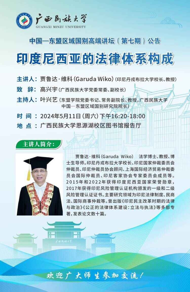 主 题:印度尼西亚的法律体系构成 主讲人:贾鲁达·维科(Garuda Wiko)(印尼丹戎布拉大学校长、教授) 致 辞:高兴宇(广西民族大学党委常委、副校长) 主持人:叶兴艺(betway必威西汉姆联党委书记、常务副院长、教授,广西民族大学中国—东盟区域国别研究院院长) 时 间:2024年5月11日(周六)下午16:20—18:00 地 点:广西民族大学思源湖校区图书馆报告厅 欢迎广大师生参加、交流! 广西民族大学betway必威西汉姆联/中国-东盟区域国别研究院 2024年5月9日