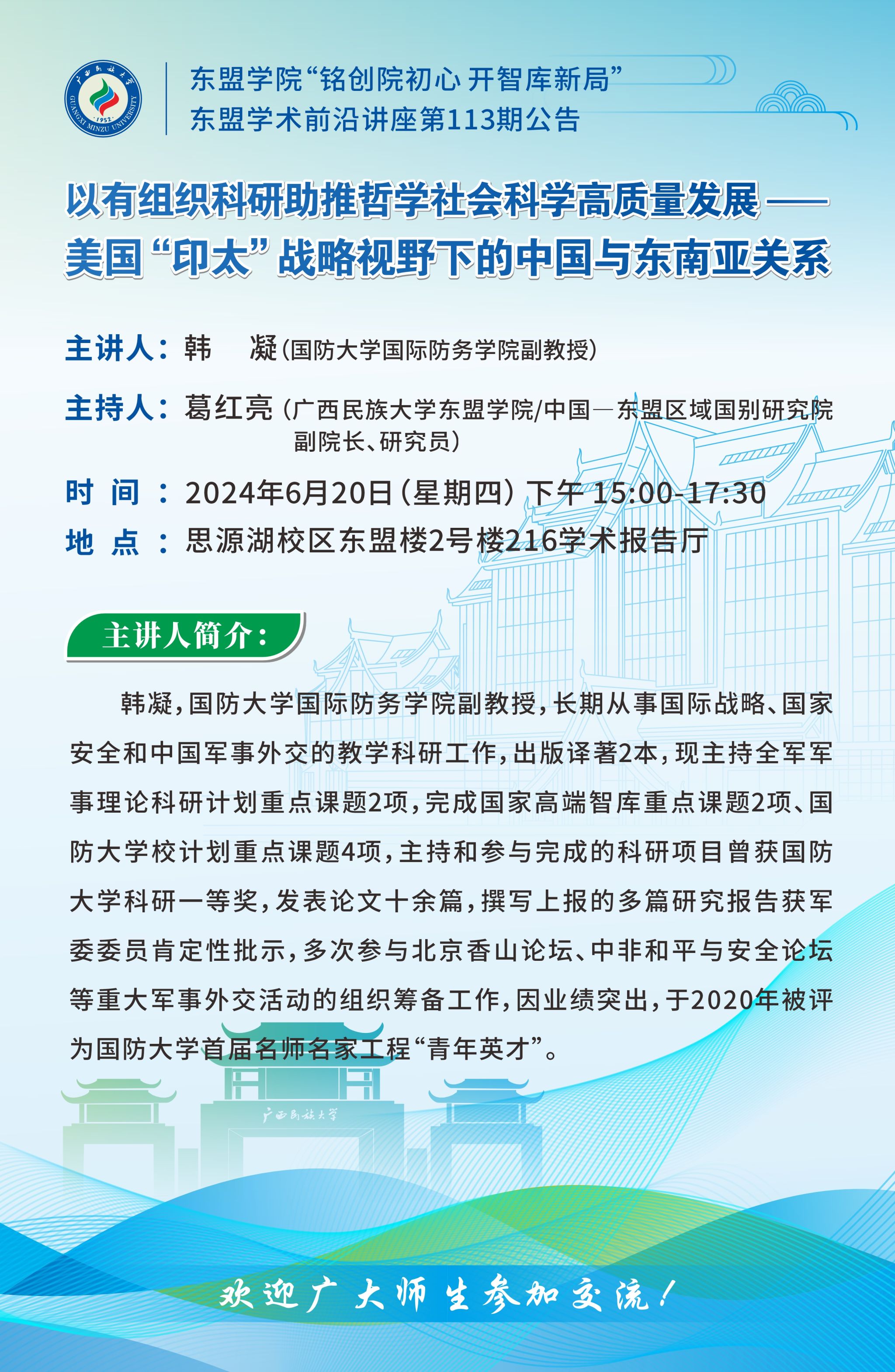 主 题:以有组织科研助推哲学社会科学高质量发展——美国“印太”战略视野下的中国与东南亚关系 主讲人:韩 凝(国防大学国际防务学院副教授) 主持人:葛红亮 (广西民族大学betway必威西汉姆联/中国—东盟区域国别研究院副院长、研究员) 时 间:2024年6月20日(星期四) 下午 15:00—17:30 地 点:广西民族大学思源湖校区东盟楼2号楼216学术报告厅 欢迎广大师生参加、交流! 广西民族大学betway必威西汉姆联 中国—东盟区域国别研究院 2024年6月19日 主讲人简介: 韩 凝,国防大学国际防务学院副教授,长期从事国际战略、国家安全和中国军事外交的教学科研工作,出版译著2本,现主持全军军事理论科研计划重点课题2项,完成国家高端智库重点课题2项、国防大学校计划重点课题4项,主持和参与完成的科研项目曾获国防大学科研一等奖,发表论文十余篇,撰写上报的多篇研究报告获军委委员肯定性批示,多次参与北京香山论坛、中非和平与安全论坛等重大军事外交活动的组织筹备工作,因业绩突出,于2020年被评为国防大学首届名师名家工程“青年英才”。
