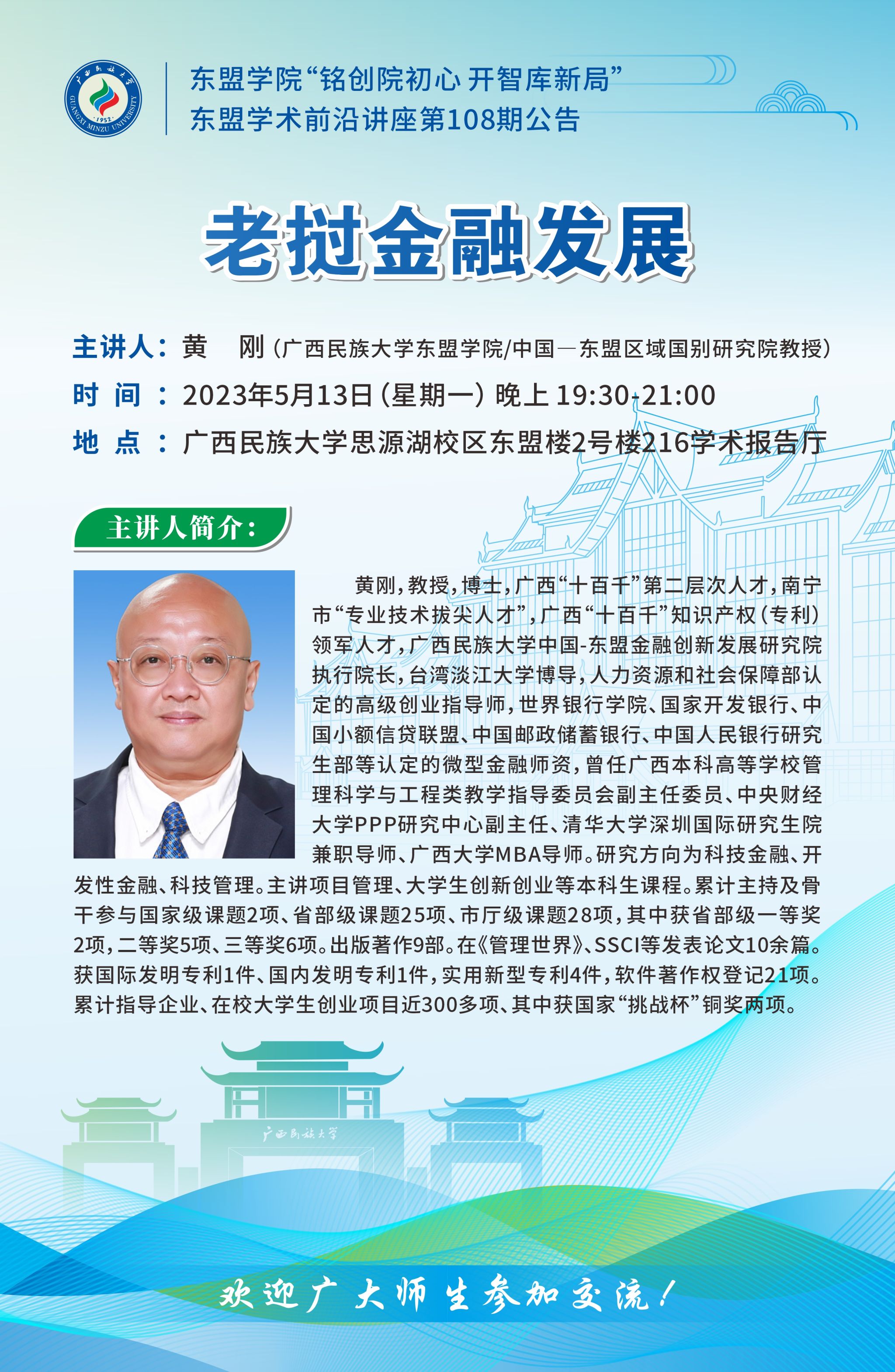 主 题:老挝金融发展 主讲人:黄刚(广西民族大学betway必威西汉姆联/中国—东盟区域国别研究院教授) 时 间:2023年5月13日(星期一) 晚上 19:30—21:00 地 点:广西民族大学思源湖校区东盟楼2号楼216学术报告厅 欢迎广大师生参加、交流! 广西民族大学betway必威西汉姆联 中国—东盟区域国别研究院 2023年5月11日 主讲人简介: 黄刚,教授,博士,广西“十百千”第二层次人才,南宁市“专业技术拔尖人才”,广西“十百千”知识产权(专利)领军人才,广西民族大学中国-东盟金融创新发展研究院执行院长,台湾淡江大学博导,人力资源和社会保障部认定的高级创业指导师,世界银行学院、国家开发银行、中国小额信贷联盟、中国邮政储蓄银行、中国人民银行研究生部等认定的微型金融师资,曾任广西本科高等学校管理科学与工程类教学指导委员会副主任委员、中央财经大学PPP研究中心副主任、清华大学深圳国际研究生院兼职导师、广西大学MBA导师。研究方向为科技金融、开发性金融、科技管理。主讲项目管理、大学生创新创业等本科生课程。累计主持及骨干参与国家级课题2项、省部级课题25项、市厅级课题28项,其中获省部级一等奖2项,二等奖5项、三等奖6项。出版著作9部。在《管理世界》、SSCI等发表论文10余篇。获国际发明专利1件、国内发明专利1件,实用新型专利4件,软件著作权登记21项。累计指导企业、在校大学生创业项目近300多项、其中获国家“挑战杯”铜奖两项。