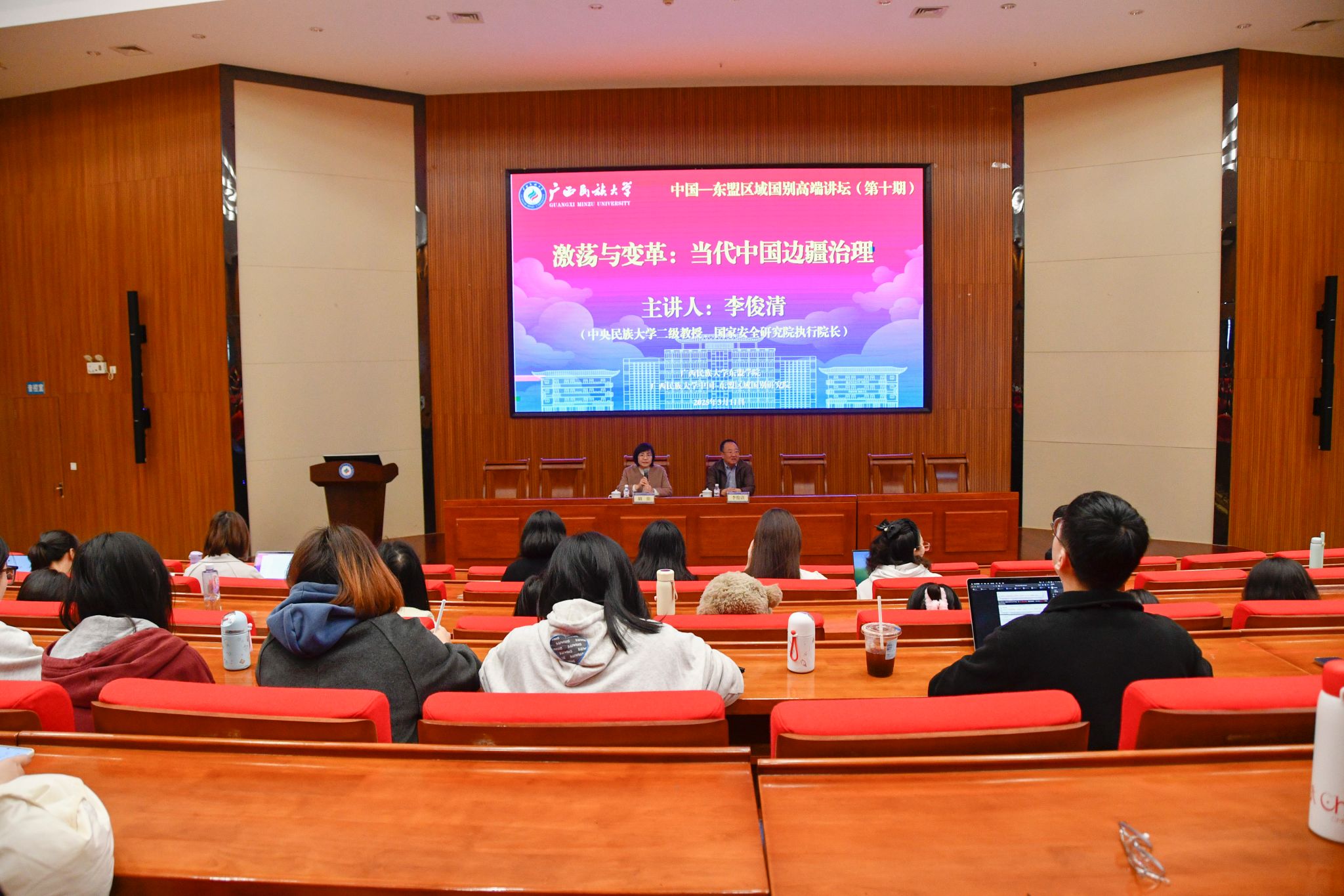 【大学生通讯社报道】3月11日,广西民族大学中国—东盟区域国别高端讲坛第十期在思源湖校区图书馆学术报告厅举行。本期讲坛以“激荡与变革:当代中国边疆治理”为主题,由中央民族大学二级教授、国家安全研究院执行院长、广西民族大学相思湖讲席教授李俊清主讲。讲坛由广西民族大学社会科学处副处长胡佳主持。