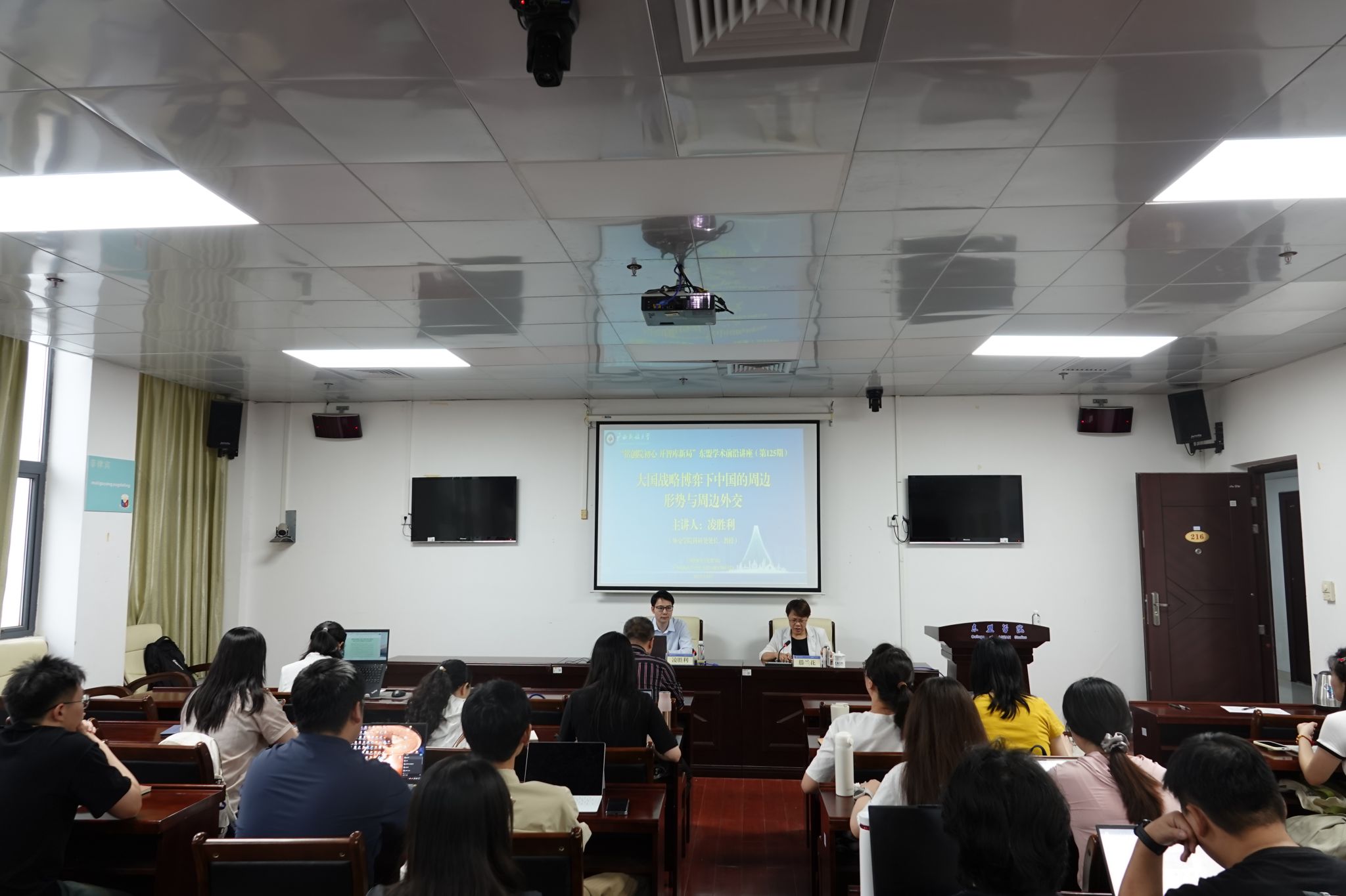 讲座中,凌胜利教授从当前大国博弈态势、当前中美战略博弈现状、中国周边形势和周边外交等四个方面为师生们展开分析阐述。他表示,当前大国博弈态势复杂,俄乌冲突、巴以冲突以及印巴冲突等地缘政治热点不断,全球经济低迷,国际贸易秩序受特朗普政府关税政策冲击;全球治理赤字凸显。就当前中美战略博弈,他指出,特朗普政府的战略重心依旧在亚太地区,希望通过战略收缩振兴国内实力,也希望以“联俄制华”、敲诈盟国、全球卸责等策略来制衡中国。 凌教授还与师生们共同回顾和学习了中央周边工作会议精神,并结合当前中国周边外交的实际分析了当前我国周边外交面临的挑战。他认为,在当前世界变局下,搞好周边的经济合作, 深化民心相通非常重要。