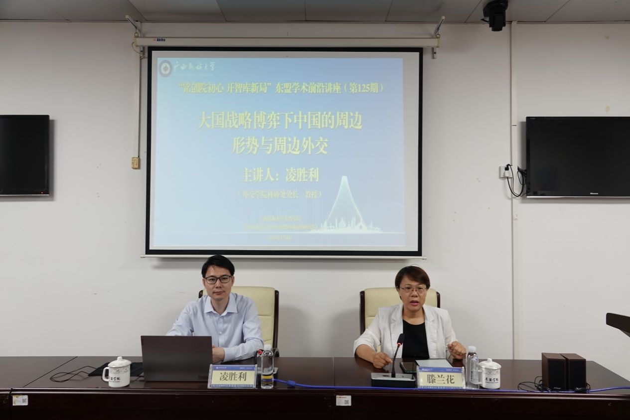 5月8日,我院在东盟楼2号楼216学术报告厅举行题为“大国战略博弈下中国周边形势与周边外交”的学术讲座。讲座由外交学院科研处处长凌胜利教授主讲,广西民族大学社会科学处处长滕兰花教授主持。