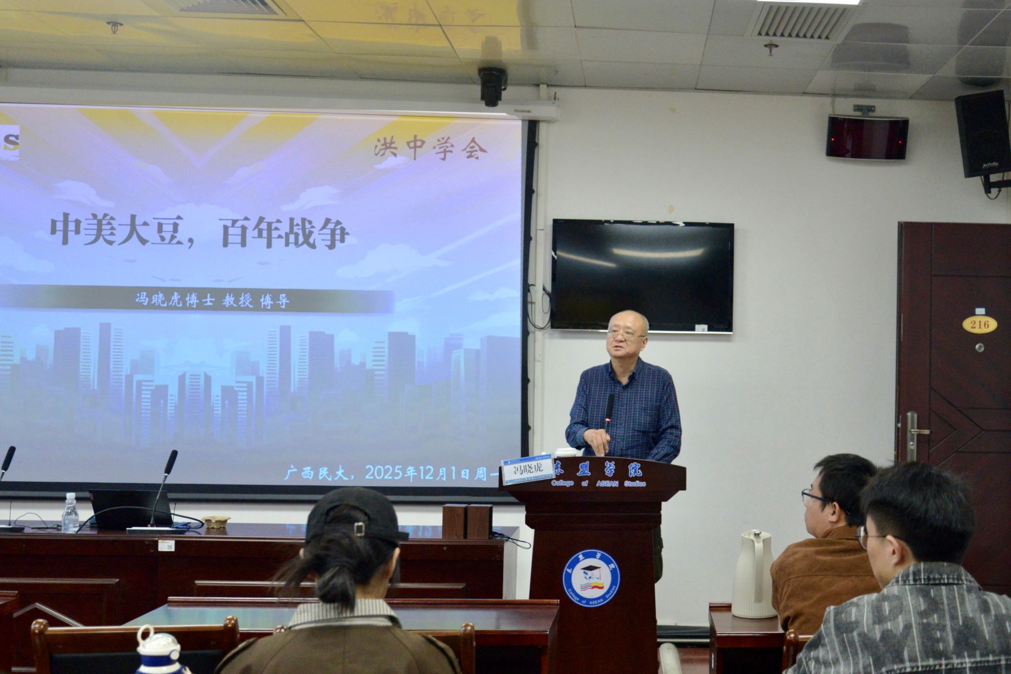 12月1日,我院在东盟楼2号楼216学术报告厅举行“区域国别研究典型范例——中美大豆百年战争”主题讲座。此次讲座邀请德国哈勒大学教授、博导,北京洪堡论坛常务副主席兼秘书长,广西民族大学相思湖讲席教授冯晓虎主讲。我院副院长葛红亮主持讲座。学院师生参加本次讲座交流。