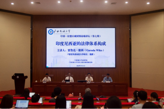 贾鲁达·维科作题为《印度尼西亚的法律体系构成》的学术报告。他从印尼的历史、社会环境及经济背景等角度对印尼法律体系的形成原因进行分析,阐述印尼法律的多元性特征、宗旨、类别、层级划分及其关系处理原则和印尼法律体系中的权力关系。他表示,印度尼西亚的法律体系的构建离不开其所处的政治经济文化背景,了解印度尼西亚的法律体系有助于推进区域国别研究,促进“中国—东盟”开展交流合作。